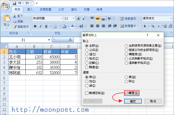 [Office小教室]Excel 行列互換 複製貼上就能輕鬆搞定 由 費爾曼 · 2017 年 06 月 15 日 Excel 的小技巧又來啦,今天小編要教各位如何把Excel中的行列互換,就像下圖這樣,完全不需重Key重打,只需要複製貼上就搞定,簡單的技巧讓您看起來就像位大師。 ▼ 先將您要行列互換的表格圈選起來。 ▼ 接著請點擊右鍵,並選擇複製。 ▼ 接著再空白的地方點擊右鍵→選擇性貼上。 ▼ 將轉置打勾,接著點擊確定。 ▼ 就這樣搞定了,是不是很Easy呢?