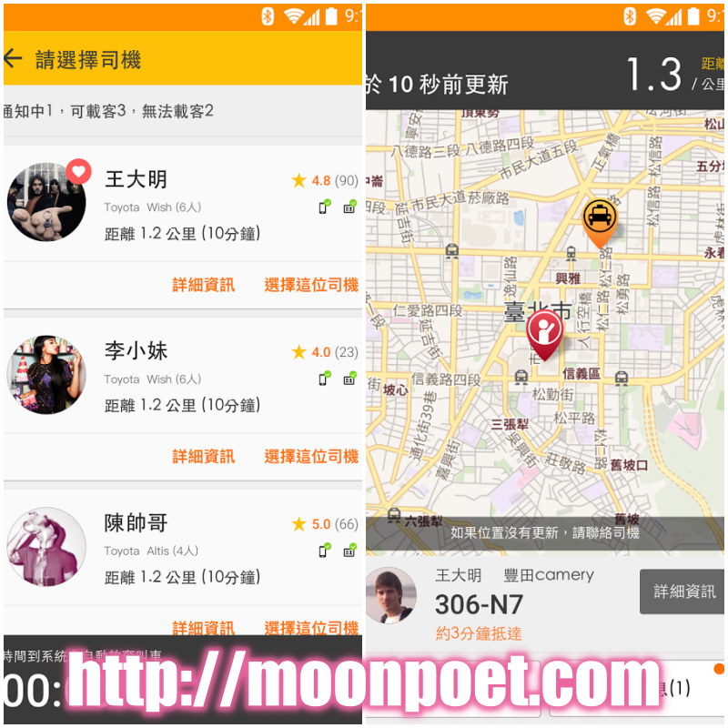 ▼ 自動配對附近的司機,並顯示地圖位置與車輛介紹,也能自行設計相關條件進行篩選。