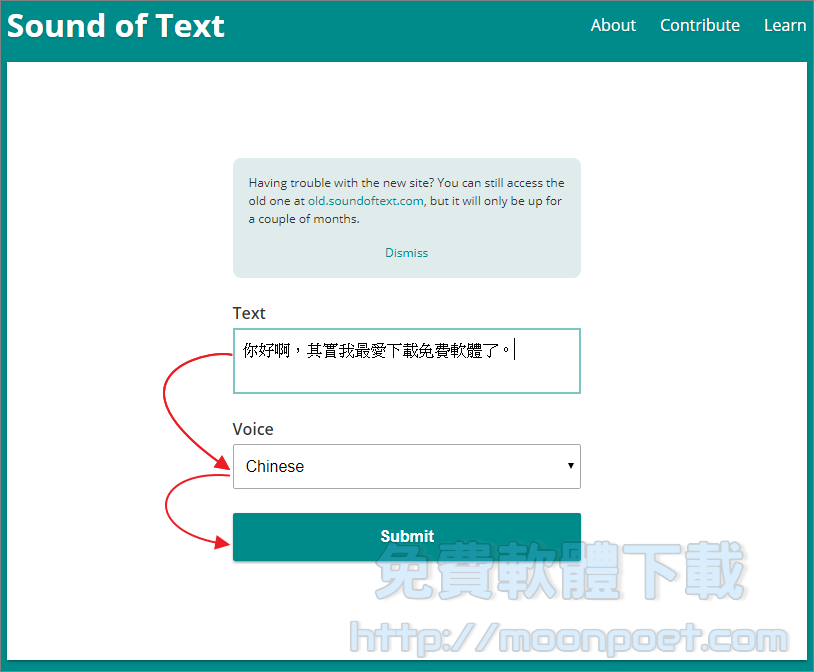 ▼ 使用方式非常簡單,請先將Voice選擇Chinese,接著在Text欄位中輸入您想要請Google小姐唸出來的詞句,按下Submit即可進行轉換。